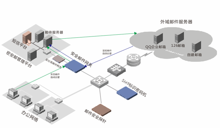 跨域安全通讯 如和已建设了SM9安全邮件系统的其他单位通讯,只需交换公共参数即可方便实现收发互相加密。